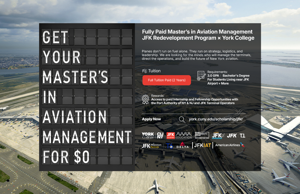 Students living near John F. Kennedy International Airport in the ZIP codes* closest to the airport can apply for a full-tuition scholarship.